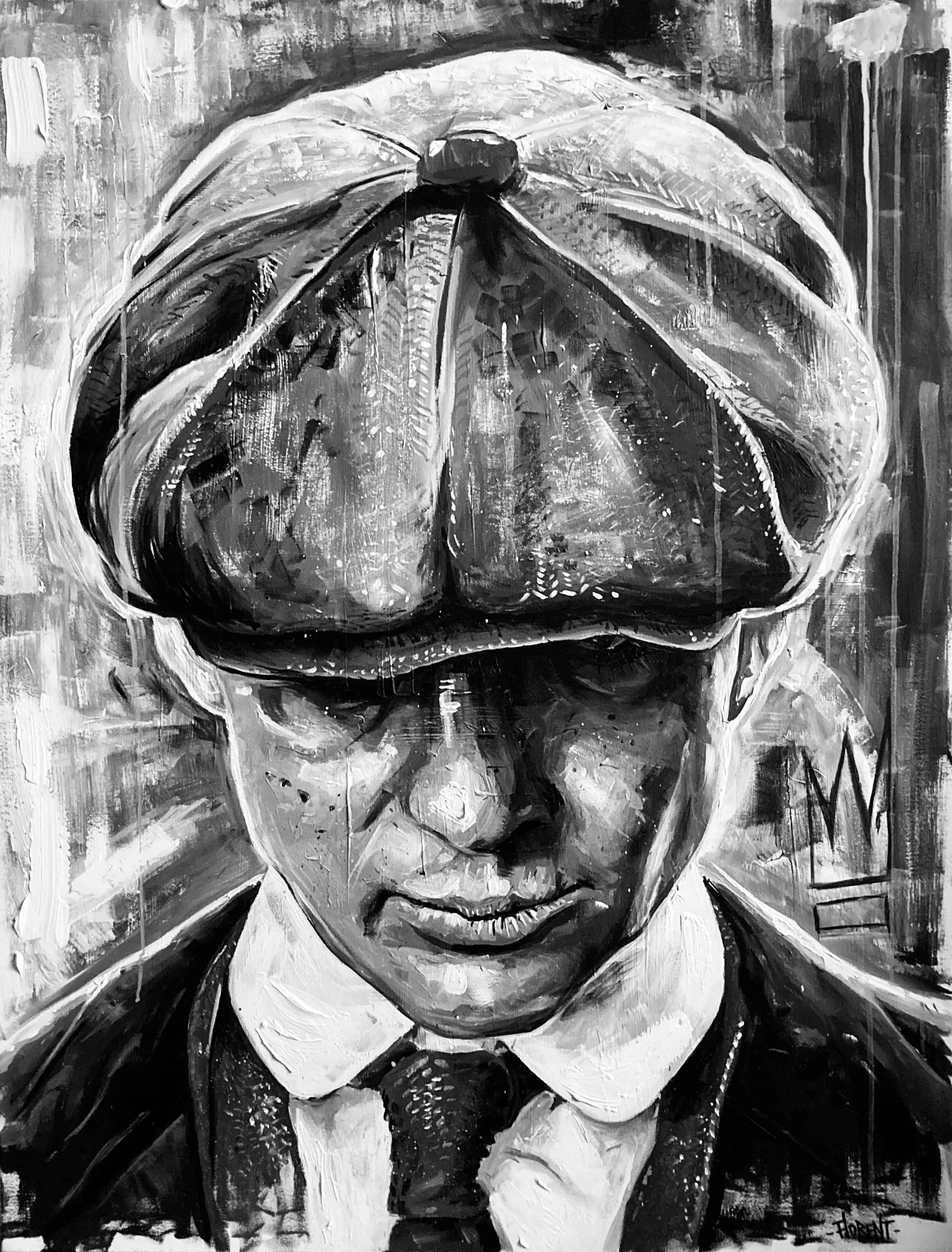 Né en 1985 dans le Nord de la France, Florent Béguin alias FLOO. montre un intérêt pour l’art dès son plus jeune âge en expérimentant le dessin et la peinture. Il suit des cours de beaux-arts à l’Atelier avec Catherine Tournay durant quelques années. Il y apprend différentes techniques comme le crayon de couleur, l’aquarelle ou encore le pastel sec. Cette passion le conduit à poursuivre des études de designer industriel et designer graphique à Rubika, où il affine ses compétences en techniques et outils variés, notamment en ce qui concerne l’aspect numérique. L’œuvre de FLOO. est caractérisée par une dualité qui combine le dessin de personnages au stylo et le portrait à la peinture acrylique. Les personnages au stylo, souvent réalisés en noir et blanc, sont sa marque de fabrique depuis toujours. Inspiré par l’univers du graff, du Street art et des caricatures, il met en avant un sens aigu du détail et une grande maîtrise des ombres et des lumières. D’autres créations sont en couleurs et utilisent des techniques comme acrylique, aquarelle, crayons, marqueurs et même du marc de café. À travers ses personnages enfantins et colorés, il commence par s’adresser avec naïveté à l’enfant qui sommeille en chacun de nous et nous transporte dans un monde léger. En seconde lecture, le travail de FLOO. pose un regard plus sombre sur l’insouciance des problèmes de notre société, (dérèglement climatique, pollution, extinctions d’espèces animales…). Il cherche ainsi à réveiller et faire réagir notre conscience d’adulte par un message plus brut, plus violent et provocant. Sa technique de peinture acrylique est remarquable et donne vie à des portraits de figures populaires ou anonymes. Plus matures, et en même temps plus libérés, ces portraits monochromes contrastent entre la sobriété du noir et du blanc et l’impulsivité laissée par les coups de pinceaux, les coups de stylos. Cela donne un résultat très percutant et incisif, notamment dans la profondeur des regards et le choix des expressions de ses personnages. Tous ces visages cultivent des émotions et sentiments entremêlés que le spectateur parvient à distinguer et s’approprier. On y retrouve un mélange d’influences Street art et Pop art. Son univers bipolaire jongle entre les expressions singulières de ses portraits et les dessins enfantins et naïfs. FLOO. cache une réalité bien plus sombre et provocante. Il cherche à susciter les émotions et la prise de conscience du spectateur. Parmi ses influences, on notera des artistes comme Monsta, Pandakroo, Sainer Etam, Stom 500, Created By Imrie, Isaac Malakkai, Dominic Beyeler, Zane Prater, et bien d’autres. FLOO. a présenté ses travaux à plusieurs reprises à travers différentes expositions dans le nord de la France. Il expose ses portraits de manière permanente au sein de différentes galeries. Aujourd’hui, FLOO. continue d’explorer de nouvelles techniques et de repousser les limites de son art. Il a récemment créé un personnage identitaire, l’Abeille qu’il va diffuser dans la rue par le biais de collages et pochoirs. Son but est de réussir à créer une passerelle entre ses deux univers distincts.